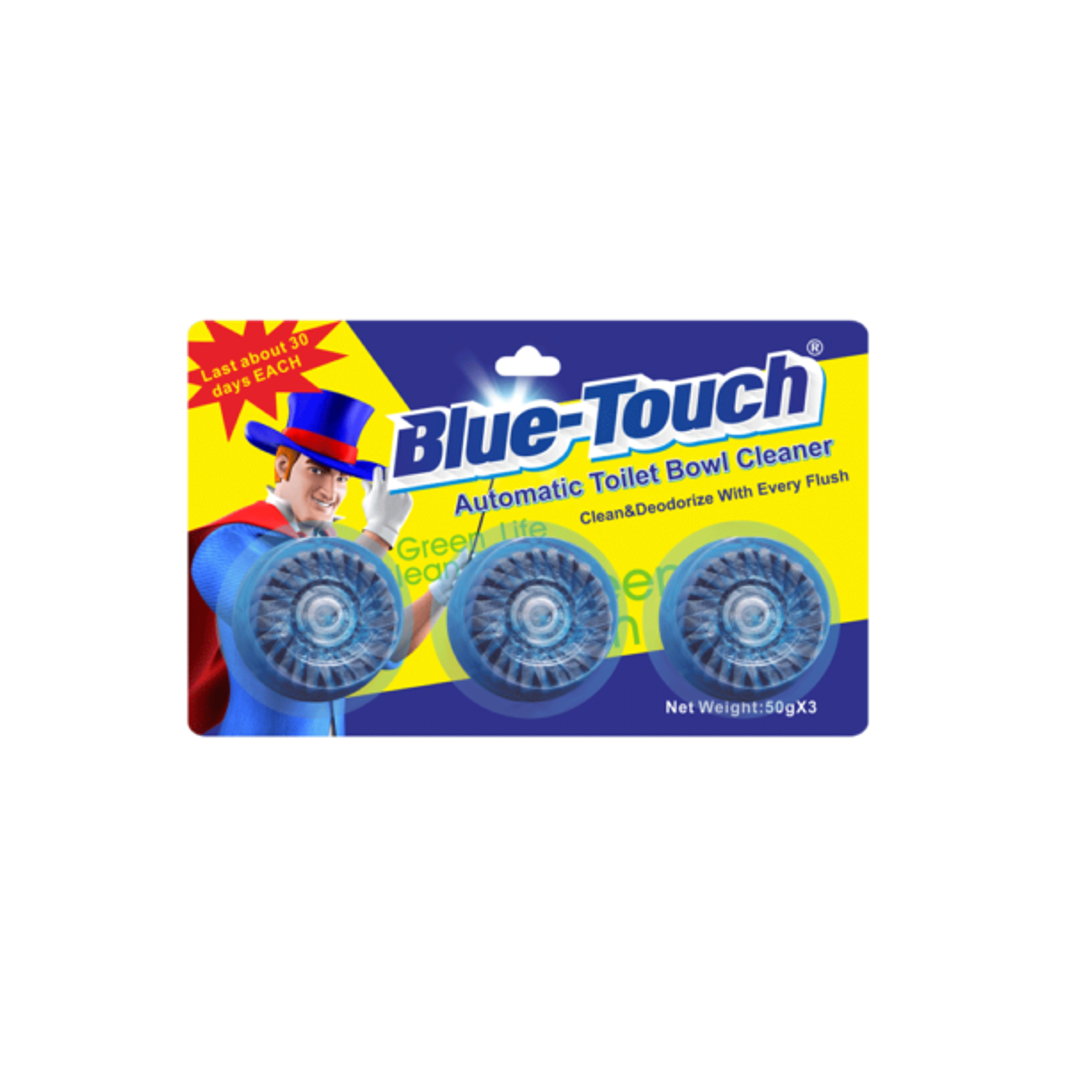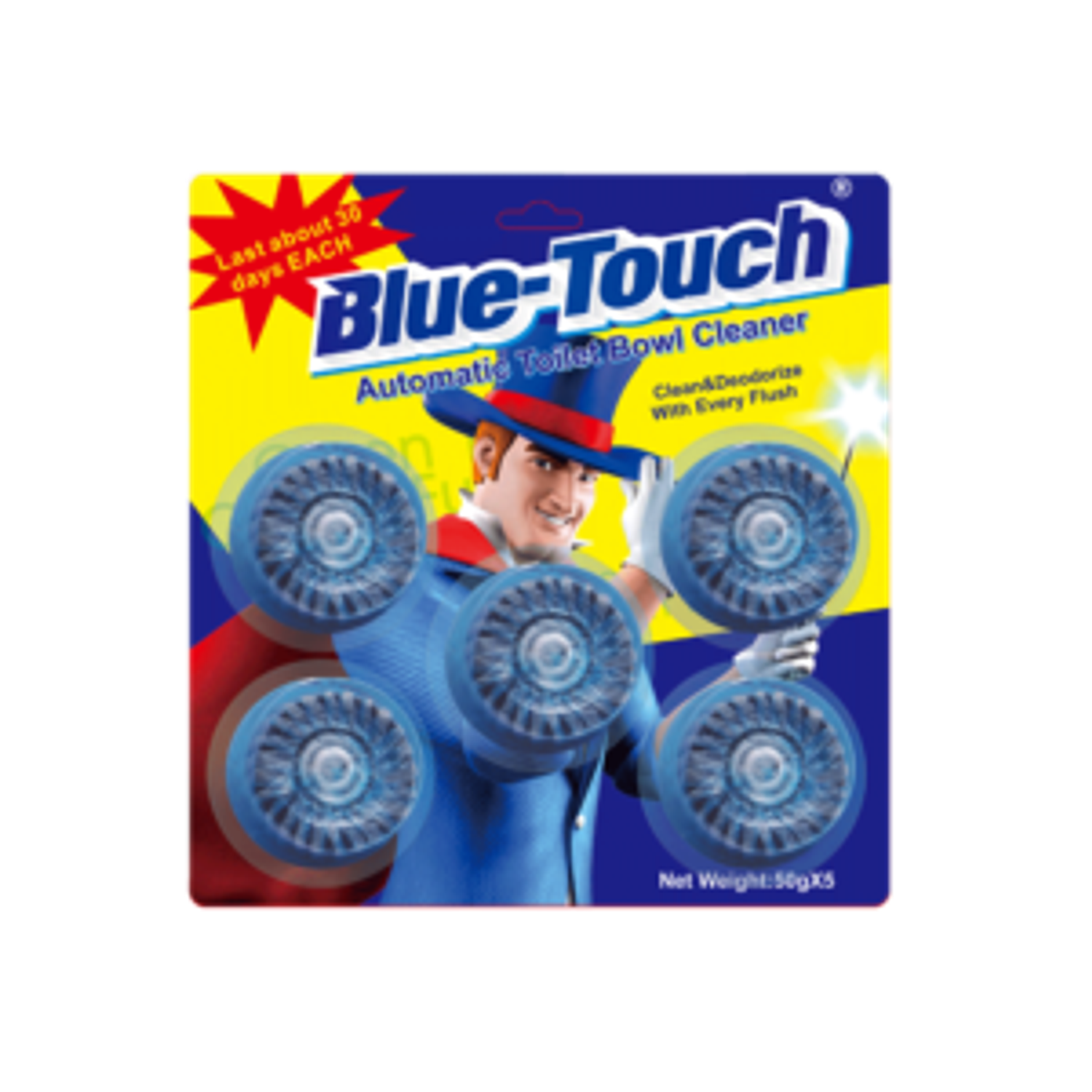 Суултуурын бочки, хөвөө, хүний гар хүрэхгүй доторхыг тань өндөр үр дүнтэй цэвэрлэнэ. Ус татах бүрт автоматаар ариутган цэвэрлэж, үнэр дарна. Ердөө нэг шахмал (50гр) бүтэн сарын турш танай гэрийн ариун цэвэр хангаж элдэв нян бактерийг устгана. Таны оролцоогүйгээр ус татах тоолонд ариутгах болно. Сантехникийн далд системд элдэв сөрөг нөлөөгүй. Ус татах тутам бага зэрэг хөөсөрсөн зөөлөн цэнхэр өнгөтэй болгоно. 2ш, 3ш болон 5ш-ийн савлагаатай