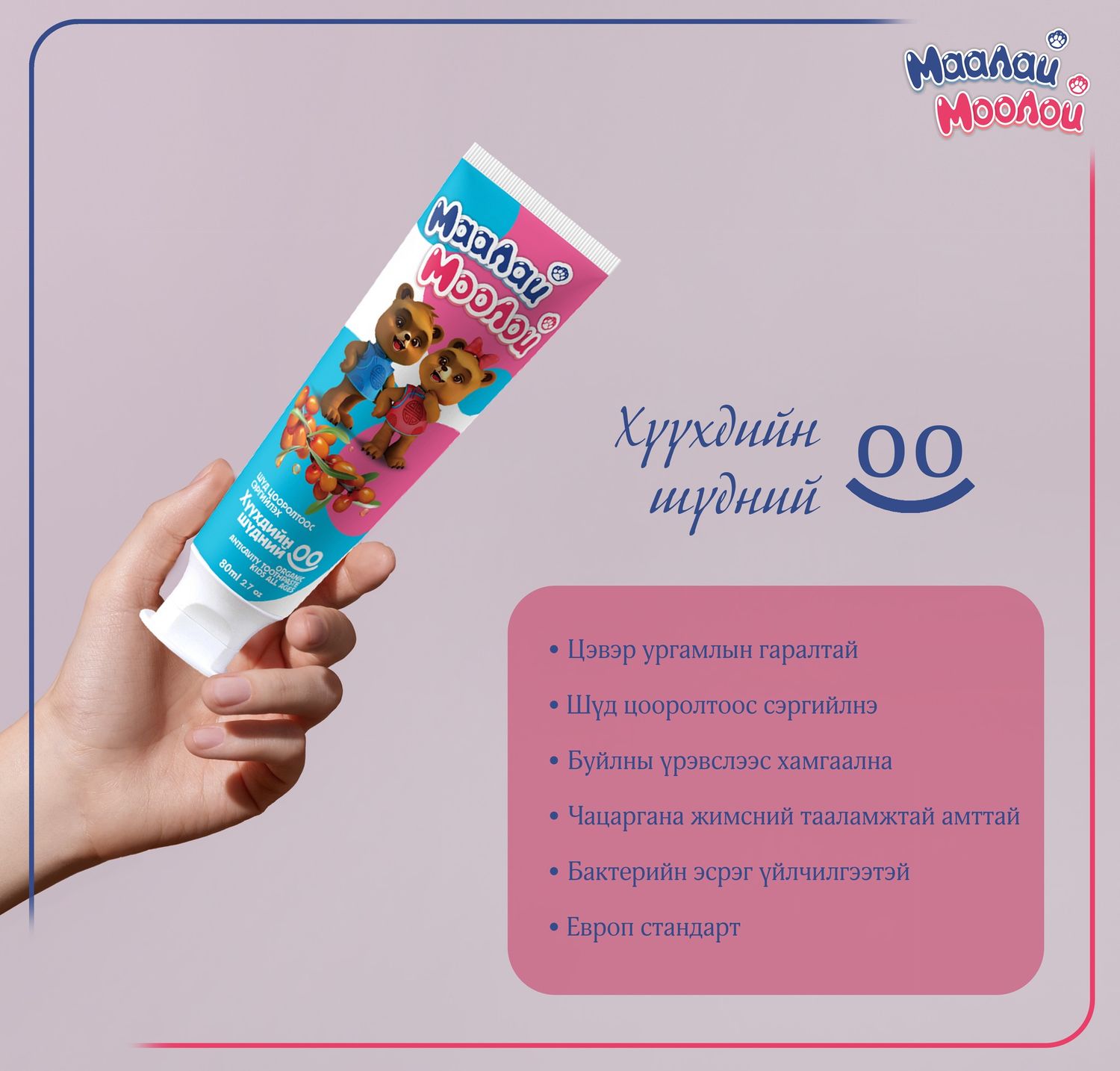 Маалай Моолой 100% БАЙГАЛИЙН ГАРАЛТАЙ БҮТЭЭГДЭХҮҮН. Чацаргана жимсний тааламжит амт нь таны хүүхдийг шүдээ илүү дуртай угаахад нь туслахаас гадна Маалай Моолой шүдний оогоор тогтмол угааснаар амны хөндийн орчинг тэнцвэржүүлж, бактерийн үржлийг зогсоож, шүд цоорохоос урьдчилан сэргийлнэ. Тиймээс өдөр бүр Маалай Моолойгоороо шүдээ угаагаарай!